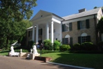 Arrivées en début de soirée, nous nous installons pour la nuit sur le Wal Mart le plus proche de Graceland. Nous avons bien fait de venir à l'ouverture car déjà la foule s'y presse. En faisant la queue déjà, une certaine excitation de visiter la maison se fait sentir. Nous voyons que jeunes et moins jeunes sont présents. Que l'on soit fan ou pas, la maison d'Elvis attire du monde. Certaines personnes se montrent impatientes et d'autres sont déjà hystériques. Difficile de garder son calme car beaucoup de gens vous bousculent alors que cela n'ira pas plus vite! Mais voilà, il faut dire qu'énormément de gens viennent avec des tours organisés. Du coup, il ne faut surtout pas perdre son groupe!! A peine montées dans le bus, la frénésie nous gagne. Le bus, c'est un peu surfait car nous n'avons que traversé la route! Nous passons le portail de "Graceland", dès cet instant vous entrez dans cette propriété si mythique. Une jolie allée ombragée nous mène, à travers le parc, devant la maison. Visite assez extraordinaire de l'intérieur de celle-ci car tout est resté intacte. Nous ne pourrons toutefois visiter l'étage car cette sphère reste privée. Il faut quand même dire que le mobilier, les tapisseries et les moquettes sont très kitsch et reflettent à la perfection les années 70. Tout au long du tour, vous avez un casque sur les oreilles et on vous raconte la vie, comme elle se passait dans cette maison. La frénésie qu'y régnait, les gens qui allaient et venaient, et toujours la musique au centre des activités. Des commentaires de Priscilla et de Lisa Marie ainsi que d'Elvis lui-même font partie de l'enregistrement. De l'extérieur la propriété ne paraît pas si grande mais celle-ci s'étend passablement à l'arrière. Il y a les écuries, les bureaux administratifs, la partie musée avec ses disques d'or et ses tenues et pour finir le racketball. Endroit, où Elvis aimait se retrouver avec des amis et chanter dans le salon adjacent. C'est d'ailleurs ici, qu'il chantera sa dernière chanson, le matin de sa mort. A l'arrière de la maison se trouve le jardin du recueillement où Elvis aimait y méditer. C'est à cet endroit que le père d'Elvis fit mettre la tombe de son épouse et de son fils. Vous y verrez également la tombe de sa grand-mère et de son père ainsi qu'une plaque commémorative de son frère jumeau. Il faut noté que les gens sont encore affligés lorsqu'ils passent devant sa tombe. A croire que c'était hier, alors que cela fait plus de 30 ans qu'il nous a quitté. Cette visite nous a fait voir un aspect de cet homme que nous ne connaissions pas. Nous ne voyions en lui que la star alors qu'en réalité c'était une âme généreuse. Il n'hésitait pas à tendre la main au plus démuni où à offrir de nombreux cadeaux à ses amis. Passionné de voitures et de motos, un musée est également visible au départ du tour. Il y a aussi son jet ainsi que son avion baptisé Lisa Marie. Là encore, tout est resté à l'identique. Si vous le voulez et si vous êtes fan, vous pouvez acquérir quelques-unes de ses tenues pour la modique somme de 1950$ la moins chère! |